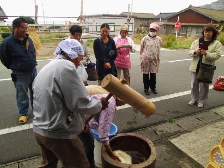 ・「収穫文化祭」では、公民館前では餅つきも。
